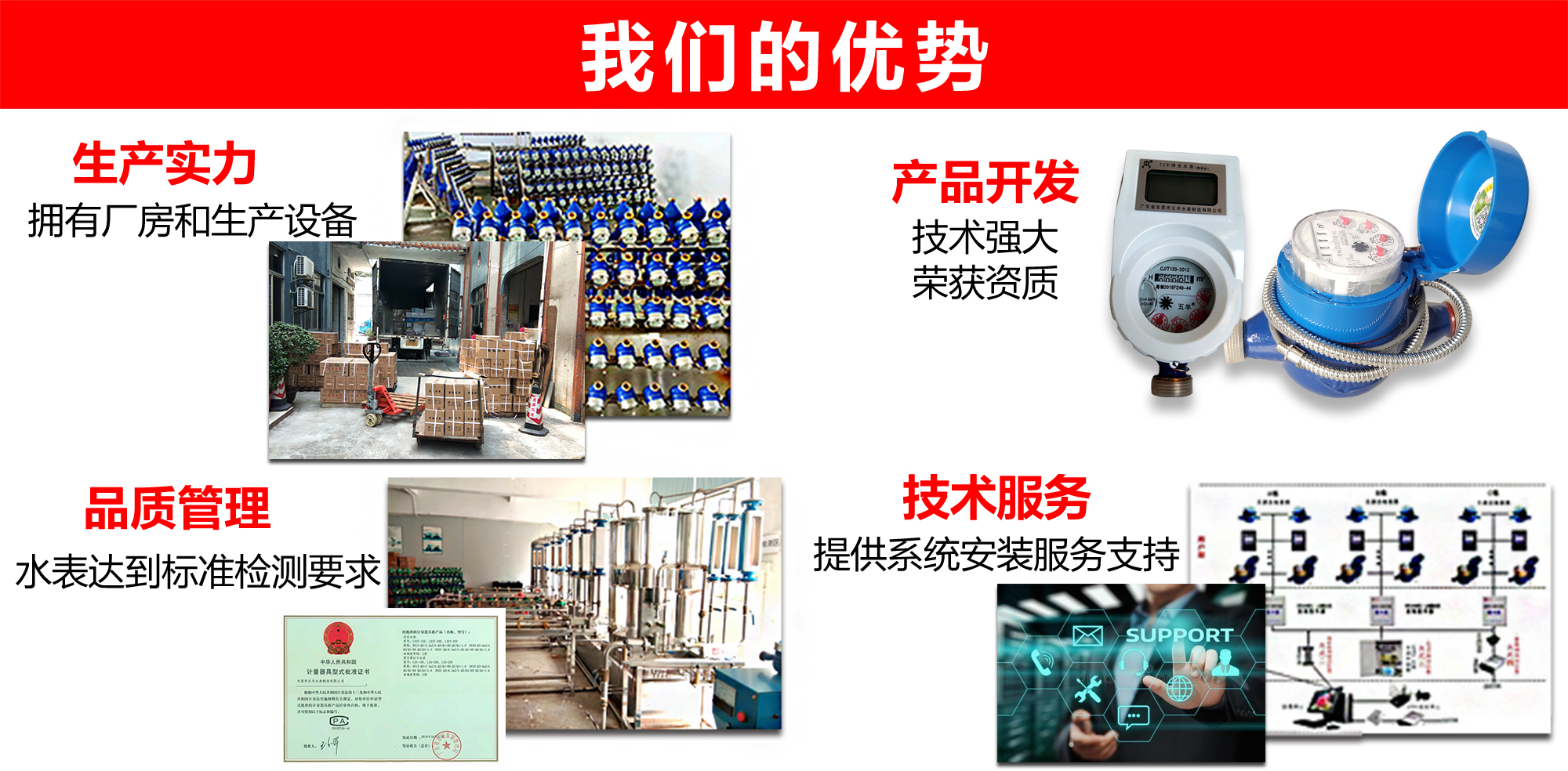 本公司是一家擁有456.jpg商標(biāo)、廣東省一家擁有五羊水表合法資質(zhì)的水表廠家。通過(guò)ISO- 2016認(rèn)證,擁有多項(xiàng)自主品牌的知識(shí)產(chǎn)權(quán),對(duì)智能卡表和光電直讀遠(yuǎn)傳表提供多種技術(shù)解決方案。